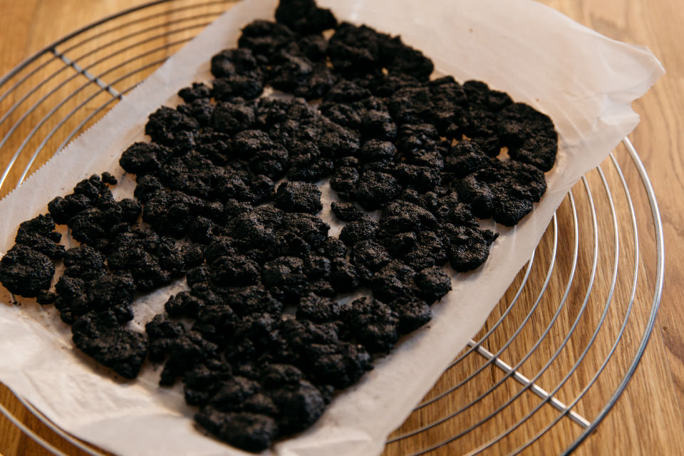 一見、溶岩のようにも見えるクランブルは、ブラックココアを使っているので真っ黒。でも超おいしいんです! 食べると、かりっ、かりっと、心地いい音を立てます。「かりかり感をキープできるように、クランブル生地には白砂糖の代わりにグラニュー糖を使い、オーブンで高温で焼きました。これなら、食べるまでに時間があっても、かりっと感をキープできるんですよ。瓶に詰める時は適当でOKです! クリームは瓶の中に自然に落ちていくので、ぎゅっと押さえたりしなくても大丈夫。持ち寄り先では、瓶につめたまま冷蔵庫で冷やしておくといいですね」と村山さん。甘いけれど甘すぎない。赤と白と黒の大人っぽいトリコロールカラー。これぞ大人スイーツって感じで素敵です!