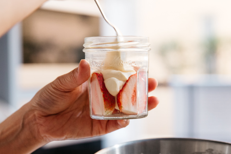 ❶よく洗った空き瓶に、いちご、クランブル、クリームを重ねて入れる(食べるまでにかなり時間があく場合は、瓶は煮沸消毒を)。