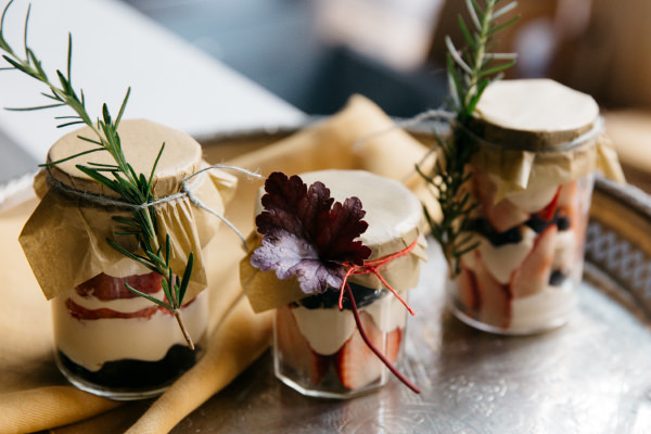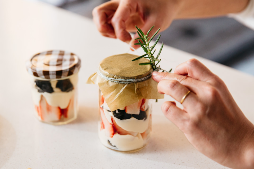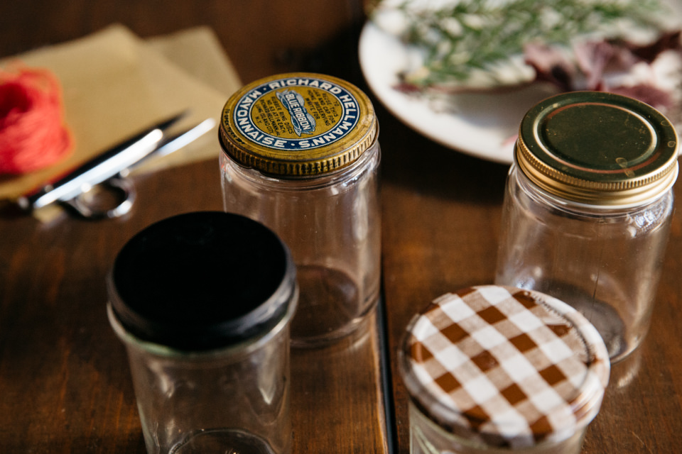 ひとくち味見をして、「スポンジが入っていると、おいしくてもたくさん食べられなかったりするけれど、クランブルだとお酒のアテにも合いそう! あ~美味しい…」と感嘆の息をこぼしつつ、伊東さんが今回用意してくれた空き瓶は、ジャムやマヨネーズが入っていたもの。「詰めてみると、チェックのふたでおなじみ、『ボンヌママン』のジャム瓶が入れやすく、量もちょうどいい感じでした。口が大きめで、ストレートな形が詰めやすいですね」と伊東さん。瓶につめたら、好きなペーパーをフタにかぶせて紐できゅっ。空き瓶の質感もあいまって、どこか懐かしい雰囲気のあるかわいいデザートに。「ローズマリーなど香りのいいハーブをちょっと添えれば、香りも楽しみながら食べられそうですよね。すぐにしおれなさそうなハーブを選んでみて!」と伊東さん。少しの工夫でも、そうした心遣いが特別な演出になりますね。さすがです!