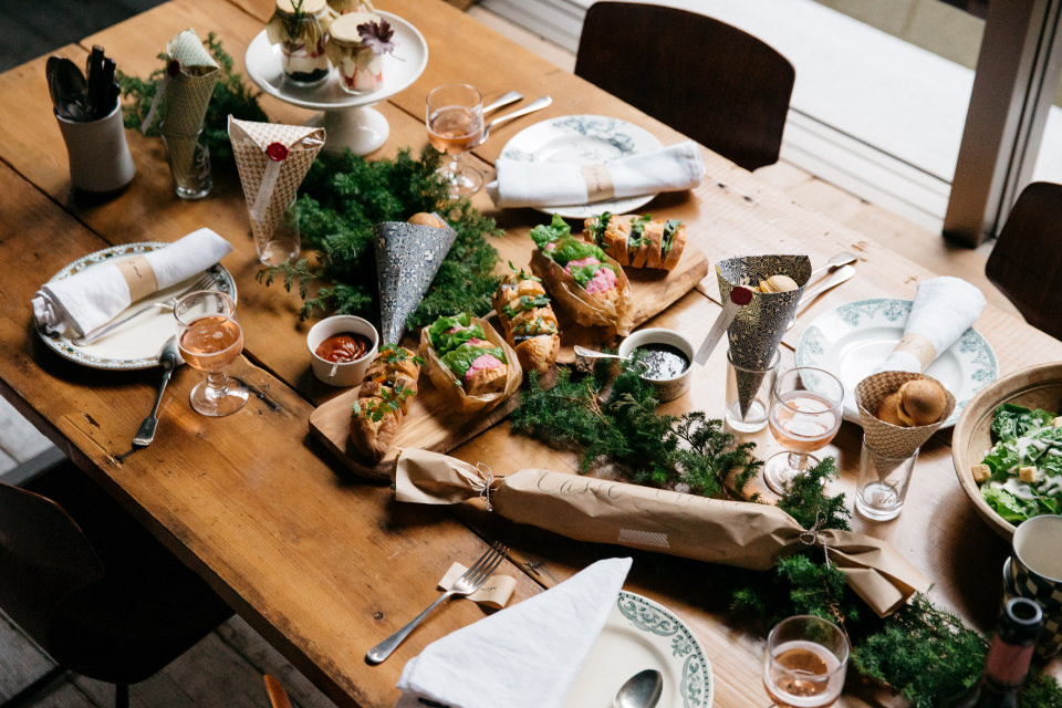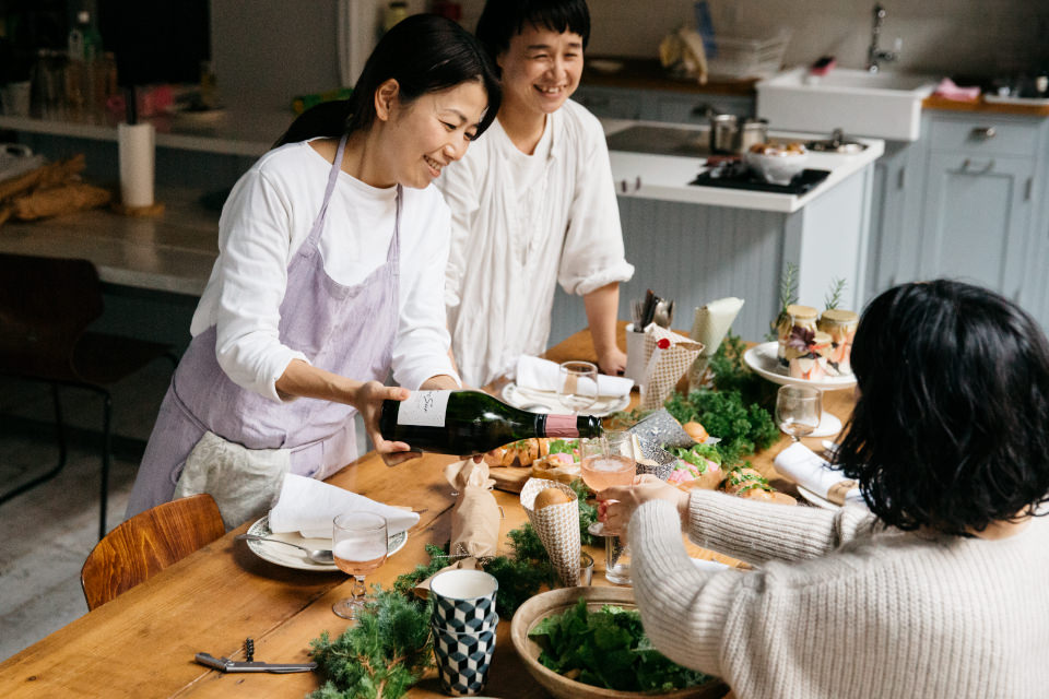 さて、3品揃ったところで、お呼ばれ気分を味わってみましょう! サラダやチーズを用意して、ロゼワインで乾杯です! 今回の3品は、包んだそのままをテーブルに置いてもいいし、持ち寄り料理の見た目も味のバランスも、ラッピングのこなれ感も素敵です。今回は3品作ってもらいましたが、実際は3つのうち、どれか1つを持ち寄るだけで十分。村山さん、伊東さんの食べる人を思うちょっとしたコツに感服。お呼ばれ上手になりそうな持ち寄りレシピ&ラッピング、是非おためしあれ!