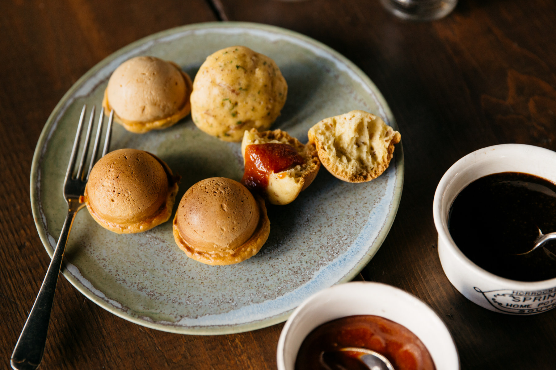 手軽に作れるスナックボウル。今回は、ごま&カマンベールチーズ、サラミの2種を用意しました。カマンベールチーズのように具がごろっと入るものは、生地をたこ焼き穴の8部目くらいまでを目安に流し入れると、程よくまんまるに焼き上がります。冷めてもおいしくいただけます。