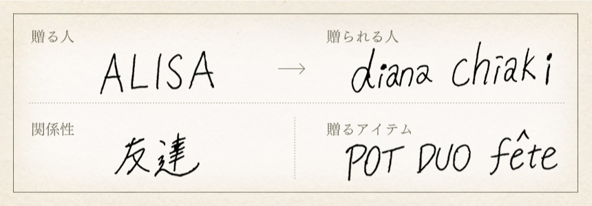 ALISA : 私がプレゼントしたいのは、モデルやDJとして活躍する、友人のダイアナチアキちゃんです。チアキちゃんとの出会いは今から2年ほど前。もともと私は雑誌やショーで彼女を見て存在を知っていたのですが、共通の知人である〈リミフゥ〉デザイナーの山本里美さんに、「2人は絶対気が合うよ!」と紹介されたのがきっかけで、会ってみることに。会って話してみると、同い年で趣味も合って、すぐに意気投合。それからは私のイベントで、バンドやDJとしてチアキちゃんに参加してもらったり、チアキちゃんのラジオ番組に呼んでもらったりして、公私ともに仲良しになりました。そんなチアキちゃんはお菓子作りが上手で、自宅に友達を呼んだり、友人宅に行って過ごしたりすることが大好きな人。プレゼントするなら、友達が集まったときに楽しめるアイテムがいいなと思い、さまざまな料理が卓上で作れる「ポットデュオ フェット」に即決しました。2〜3人で集まることが多いので、サイズ感もちょうどいいと思います。自分用ならシックなネイビーを選びそうですが、贈り物として選ぶなら、華やかな方が嬉しいかなと思い、色はレッドにしました。それにレッドはチアキちゃんのパキッとしたイメージにもぴったり。今度遊びに行くときは、「ポットデュオ フェット」で一緒にお料理して、みんなで女子会を楽しみたいと思います。