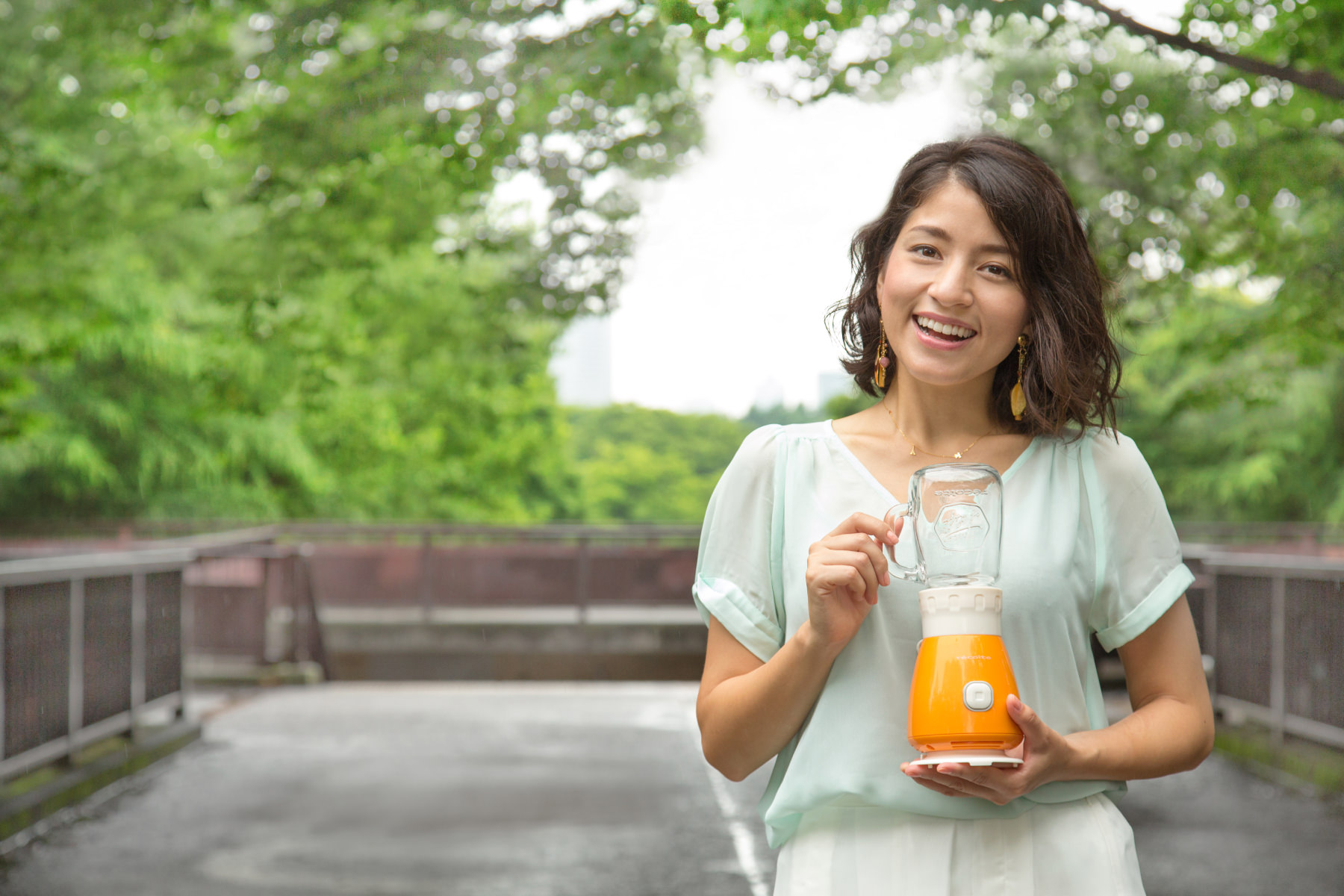 比嘉バービィ:私が真っ先にプレゼントを贈りたいと思った相手は、モデル仲間の比留川游ちゃんです。游とはモデルの仕事がきっかけで出会い、お互いお酒好きで趣味も合うし、仕事のことや将来について語り合うことも多く、自然と仲良くなりました。お家に泊まりに行くこともあって、この前は「バービィのためにソファ買ったんだ!」というサプライズもありました(笑)。それくらい仲の良い友人です。游は大のスムージー好きで、1日の食事をスムージーだけで済ますこともあるほど。でもいつもお店で買って飲んでいる印象があったので、家でも簡単に作れるようにと思い、[ソロブレンダーソラン]を選びました。コップにわざわざ移し替えなくても、そのまま外してすぐに飲めるのがいいですよね。プレゼントを贈るときは、いつもその人の雰囲気に合う色を大事にしているのですが、游は普段ブラックを着ていることが多いので、カラーについては結構悩みました…。でも、游の部屋の雰囲気は優しい自然色で統一されているのを思い出し、オレンジだとインテリアにも合うし、鮮やかなビタミンカラーが映えて素敵だなと思って、この色に決めました。健康志向でおしゃれな游ならではのセンスで、いろんな材料の組み合わせを試してもらって、ますます美しくなってもらえたら嬉しいです♡