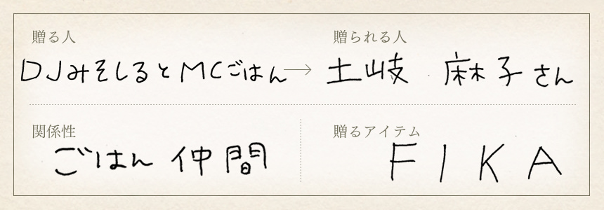 DJみそしるとMCごはん:私が贈る方は、歌手の土岐麻子さん。土岐さんは私と同じく食べることが大好きな方で、「ここのお店がおいしいよ」と、よくお店の情報交換をしたり、一緒に食事に行ったりするごはん仲間です。事務所の大先輩で、いつもお世話になっている土岐さんにお返ししたいなと思い、今回ギフトをお贈りしました。アイテムは、全自動コーヒーメーカーの[フィーカ]を。コーヒー好きで、ご自宅で歌詞を書くことが多いという土岐さんの休憩のおともにピッタリだなと思い、選びました。土岐さんは、私にとって憧れのお姉さんでもありますね。歌詞にも表れているように、土岐さんの目線ってすごく面白くて。東京をテーマにした曲をたくさん書かれているんですが、私は静岡から東京に上京してきたので、自分の東京暮らしを励ましてもらえているような……そんな気持ちになるんです。歌声もきれいですが、話し声もすごく素敵で、一緒にお話しているだけで心地よくなります。もっと聞きたい!と、毎回思うほど(笑)。大先輩ですが、優しくて気さくでチャーミングな、不思議な魅力をもった人。そんな風に、プレゼントを贈るときは、その人についてたくさん考えちゃいますね。その人に似合うもの、実際に使ってもらえるものがいいなと思いながらいつも選んでいます。だから今回も土岐さんの生活スタイルをお聞きしながら、綿密にリサーチしました(笑)。普段は手動で豆を挽いて飲んでいると仰っていたのですが、[フィーカ]は全自動式なので忙しいときでも手軽に使ってもらえると思います。仕事の合間に、あったか〜いコーヒーでひと休みしてもらえると嬉しいです!