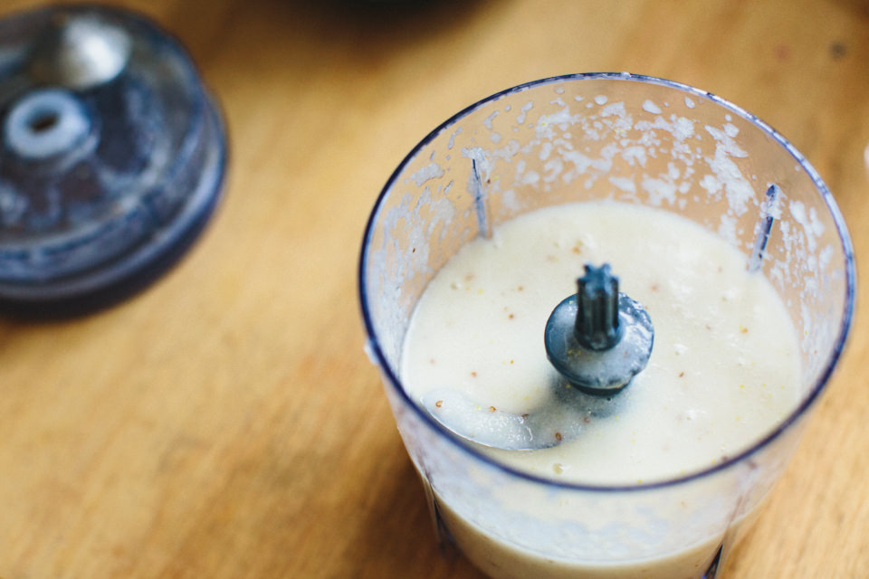 適当な大きさに切った新玉ねぎ1個を本体のカップ部分に入れてセット、味付けは粒マスタードと塩胡椒、リンゴ酢のみです。あとは本体をセットし、ワンプッシュするだけ。30秒〜1分間ほど、「カプセルカッター キャトル」にかけていきます。「ポイントは油を3回くらいに分けて入れること。こうすることで油が分離せずきれいに乳化するんです。味付けは、好みによってはハチミツを入れても良いかもしれませんね」