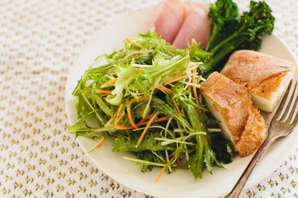 O:早いときは朝の6時くらいから、ずっと立って仕込みをしています。陽の光がたくさん入って気持ちいいので、なるべく朝早くから立ちたくて。そのため朝食は仕込みの合間にコーヒーを淹れて、お菓子をつまんだりして軽く済ませることが多いです。お昼近くになったら、今日作るブランチのようにワンプレートでサラダを作って食事を済ませ、また仕込みや試作品を作ったり。そうしているうちに夜になると、ほぼ毎日友達がご飯を食べに来ます(笑)。
