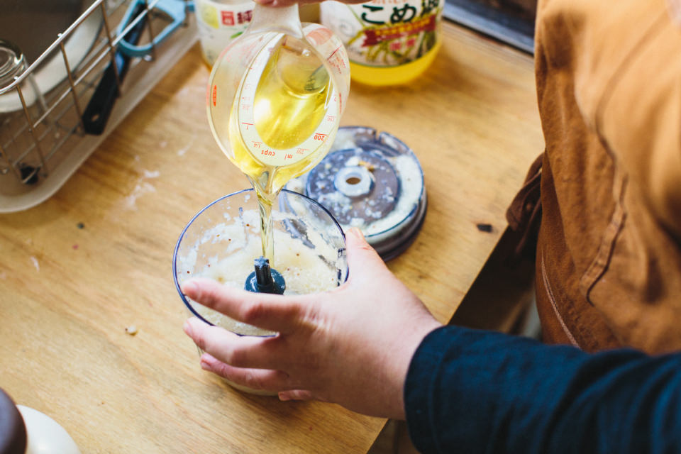 3 2がしっかりと液状になったところに、米油を少量ずつ3回に分けて加え、都度撹拌してしっかりと乳化させる