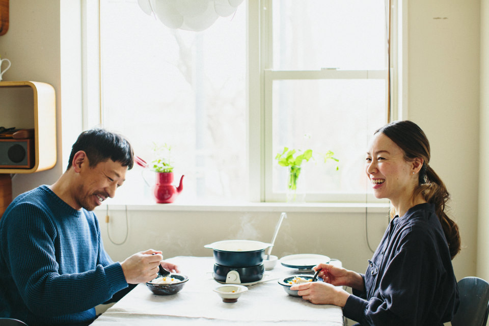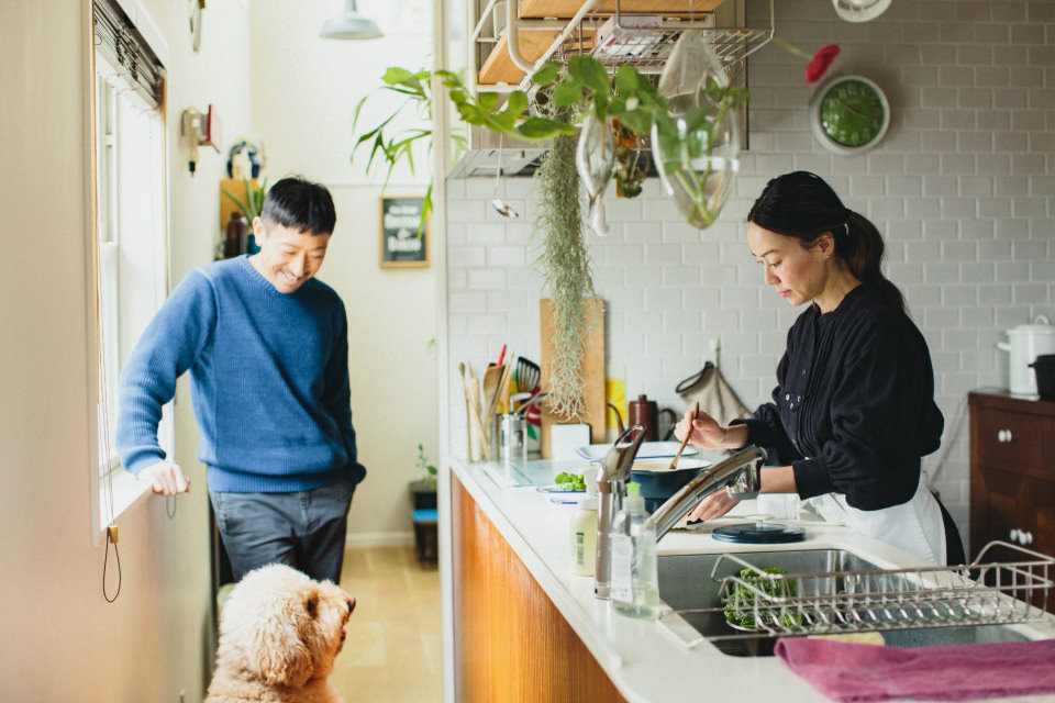 今回お会いするのは、アートディレクターとしてデザイン会社「Super me inc.」の代表を務める山口アツシさんと、「Super me inc.」のマネージャー・スタイリスト・参鶏湯研究家・「HOME KITCHEN PHARMACY」主宰と、さまざまな肩書きをもつ奥さま、脇もとこさんご夫妻。緑豊かな世田谷にある事務所兼ご自宅で、中学生の娘さんと3人+愛犬1匹で暮らしています。前編では、娘さんが登校したあとのご自宅にお伺いして、「ポットデュオ フェット」を使って参鶏湯(サムゲタン)を作っていただきました。