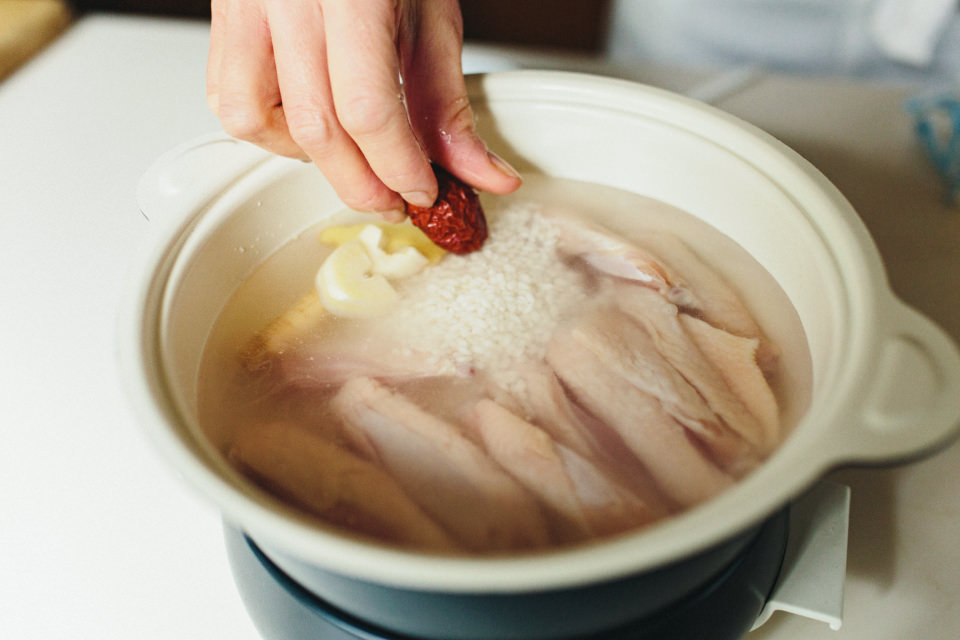 もち米の上に手羽中を並べて水を注ぎ、具材と塩を入れて沸騰するまで煮立てます。アクを取り除いたら、あとは蓋をして弱火で15分ほど煮込むだけ。「参鶏湯は調味料が塩だけとシンプルなのにおいしくて、ひと鍋で完成するところが好き。やさしい味で食べると元気になるんです」