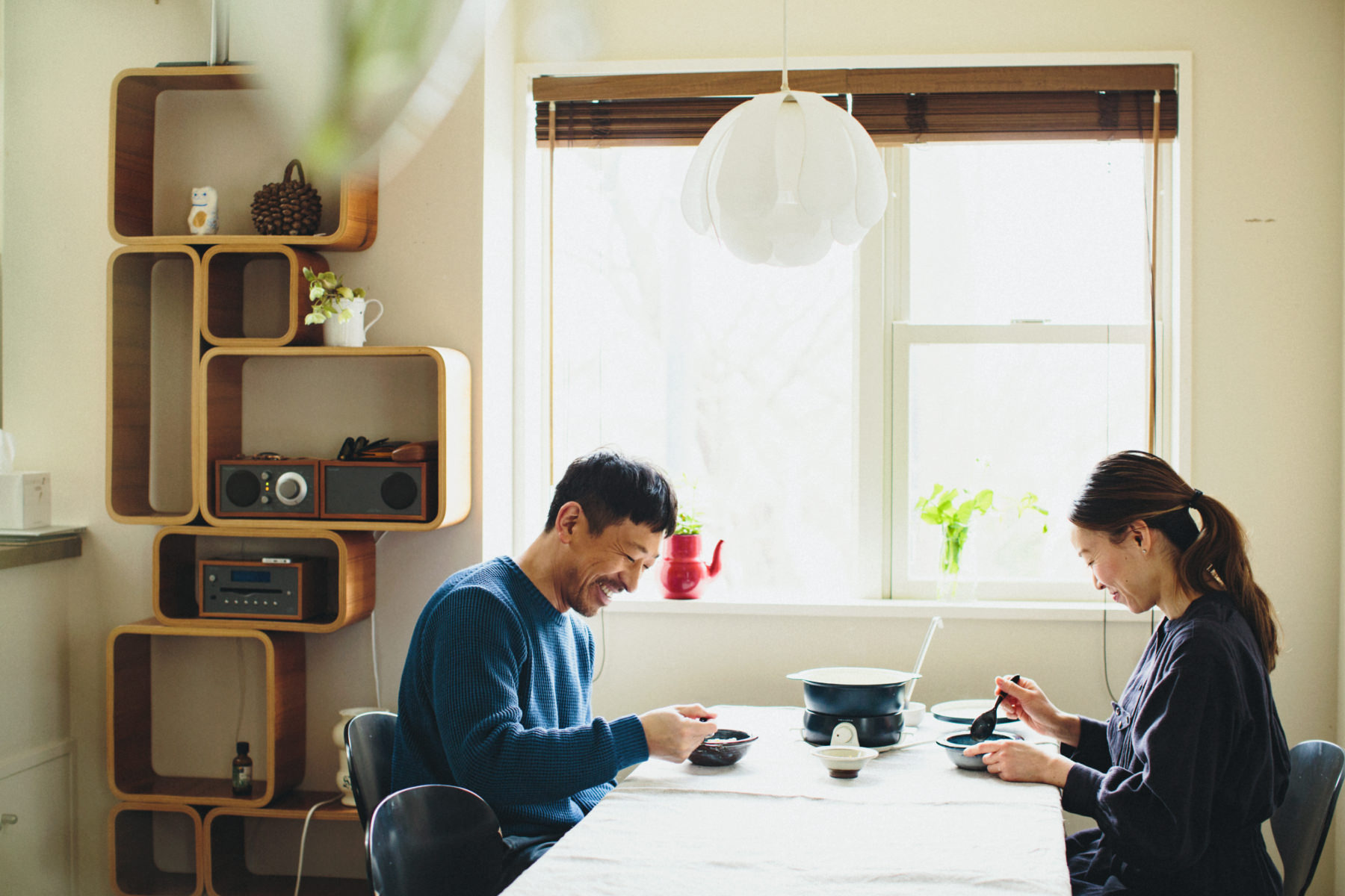 W:お鍋で作るときと同じように、とてもおいしくできました。骨つき肉ならきちんと鶏の旨みが出て、本格的なレシピと同じくらいおいしくいただけます。「ポットデュオ フェット」を使うと、キッチンのお鍋から分けて器で出すだけじゃなくて、囲みながら楽しめるのがいいですね。インテリアに馴染む、シックなネイビーの色合いもお気に入りです。