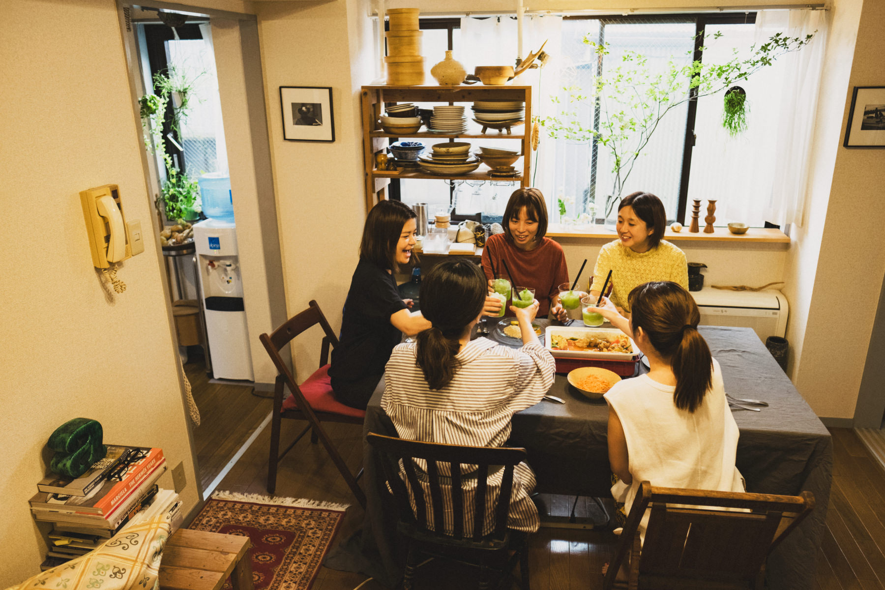 —光が心地いい食卓でランチ会、楽しみですね。棚には食器も多く並んでいますが、どれも趣があって素敵ですね。どこで見つけるんですか?