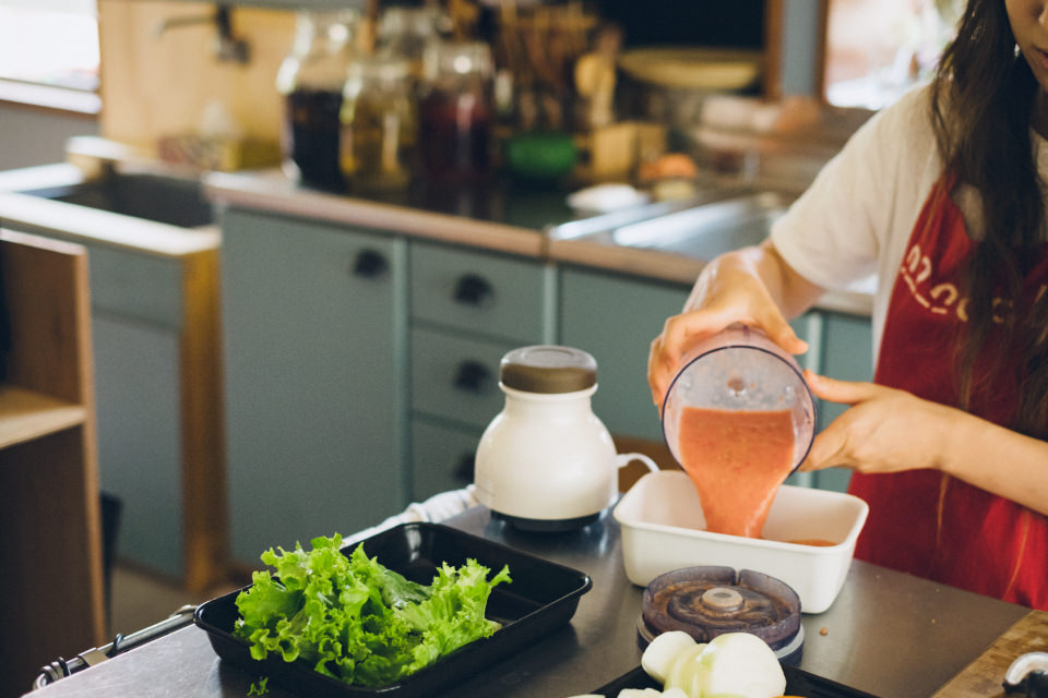 2 【ドライカレー】を作る。トマトを[カプセルカッター キャトル]でジュース状になるまで撹拌する