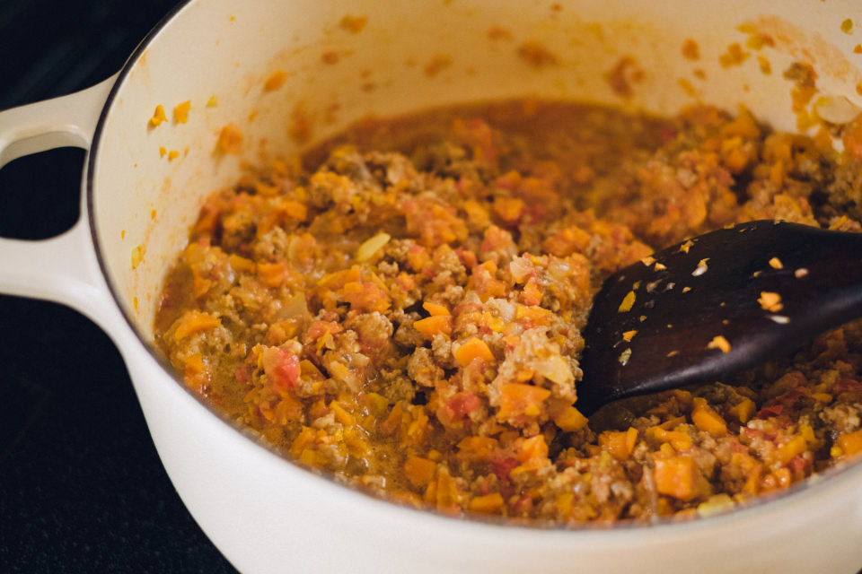 8 手順2のトマトピューレを加えて、水分がなくなるまで弱火で15分ほど加熱し、塩で味を整えたらドライカレーの完成