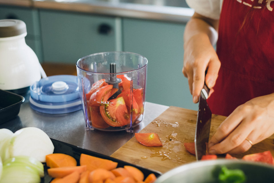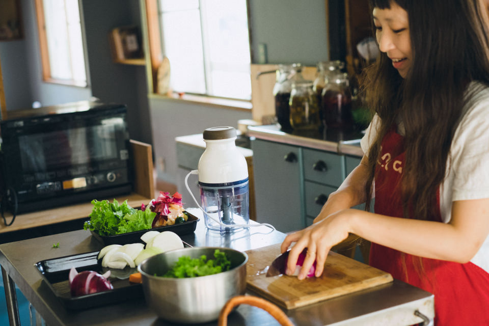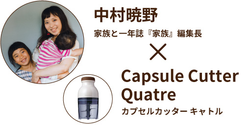 W:そうです。新鮮でおいしいのですが、やはり子どもは苦手な野菜もあるので……。でも子どもにとって食べにくい野菜は、細かく刻んで料理すると、先入観なく食べてくれるんです。刻むのは結構大変なんですが、[カプセルカッター キャトル]を使うとあっという間みじん切りになって、とても楽ですよね。今日はお肉も塊り肉からひき肉にするので新鮮でおいしいはず。娘もきっと、たくさん食べてくれると思います。カレーに添えるサラダのドレッシングも、[カプセルカッター キャトル]で作ります!