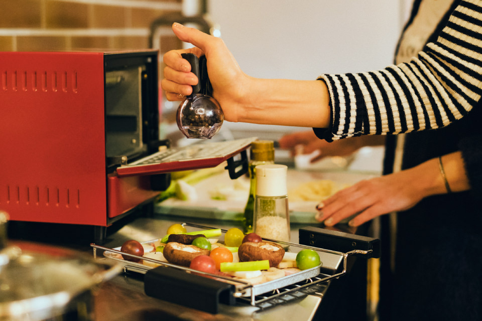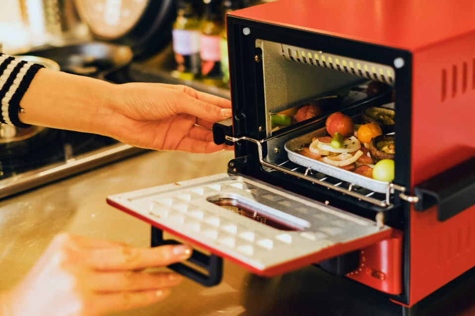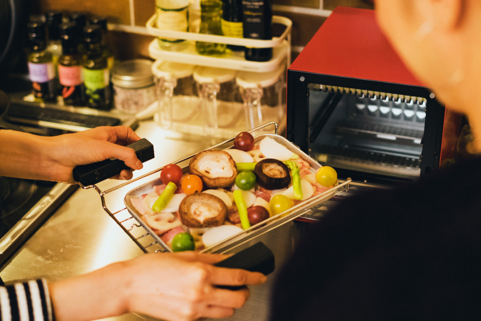 M:帰ってくる時間がバラバラなので、早く帰宅したメンバーから先に準備を始めることが多いです。でも待ってるとお腹がすいちゃうので、今日は女子会の準備の前に、手軽に作れてサッと食べられるメニューを作ろうと思います。野菜とベーコンを適当な大きさに切ってトースターでグリルするだけの簡単メニューです。レコルトの[スライドラックオーブン デリカ]は小ぶりだけど奥行きがあるから、こんな風に2 人分を作ることもできるし、キッチンに置いてて圧迫感がなくてちょうどいいサイズですよね。