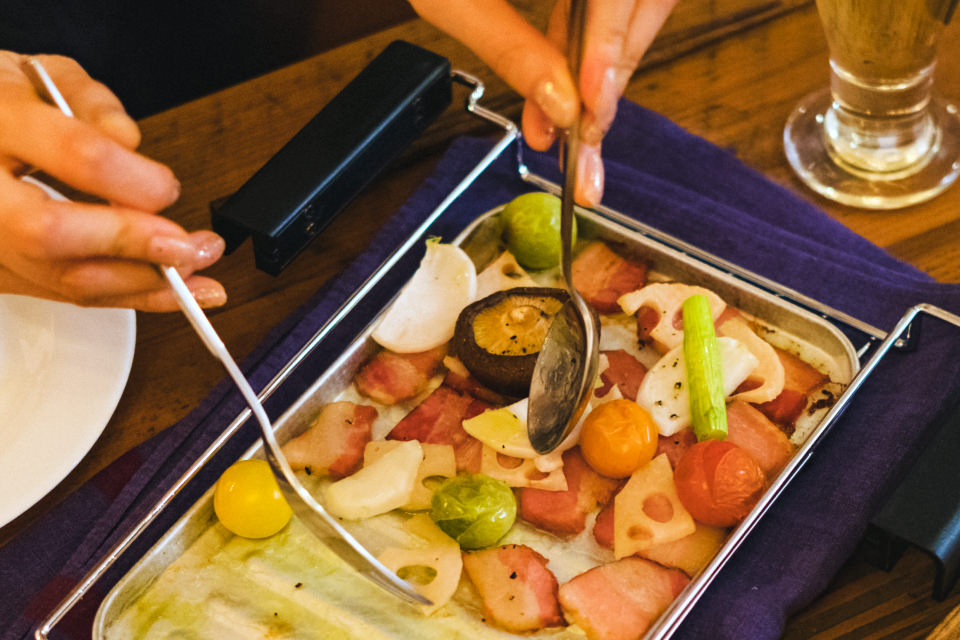 野菜やベーコンを切ってトレイに並べたら[スライドラックオーブン デリカ]でグリルするだけ。手軽にできるのにおいしくて、お酒のおつまみにもぴったりです。