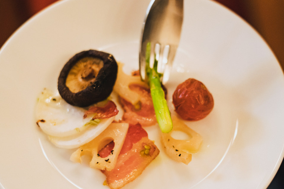 ベーコン…適量 /れんこん、かぶ、アスパラ、ミニトマト、しいたけなど…適量 /粗挽き黒こしょう…適量 /オリーブオイル…適量