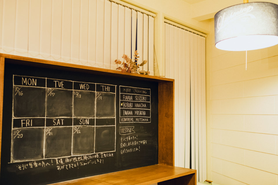 I:誰が在宅しているか分かるように玄関に札がかけてあったり、みんなでスケジュールを共有したり掃除当番を割り振るための黒板が備え付けられているので、とても暮らしやすいんですよ。