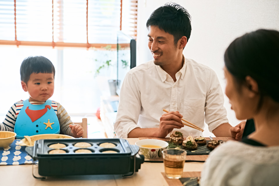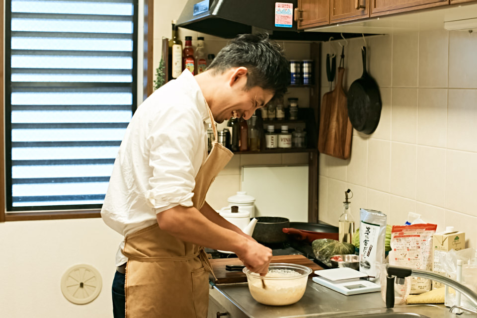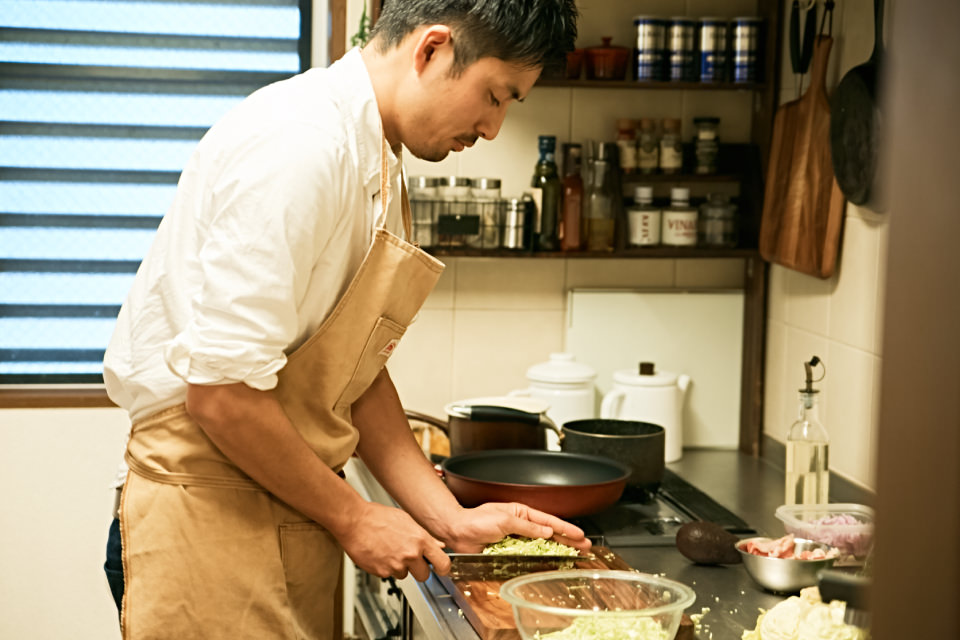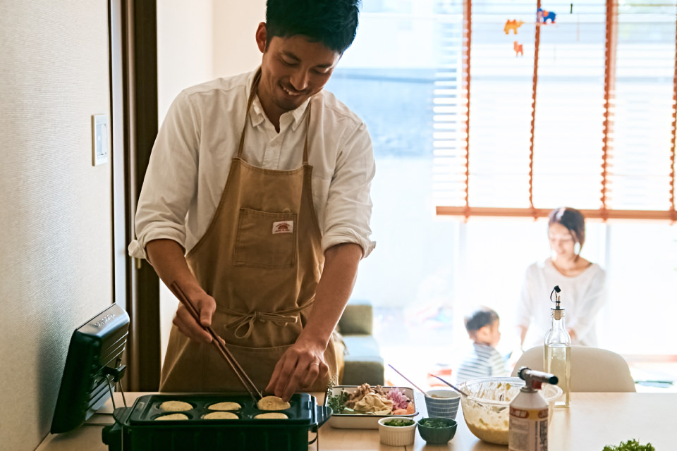 今回お会いするのは、「アツヲ飯」という屋号で出張料理やケータリング、出店料理活動を行う一児の父・中上敦夫さん。三鷹にあるご自宅のマンションで、奥さまの由紀子さんと1 歳になる息子さんの翔真(しょうま)くんの3 人で暮らしています。前編では休日の中上家にお邪魔して、[ホームバーベキュー]を使った、アレンジ満載の“オリジナルお好み焼き” を作っていただきました!