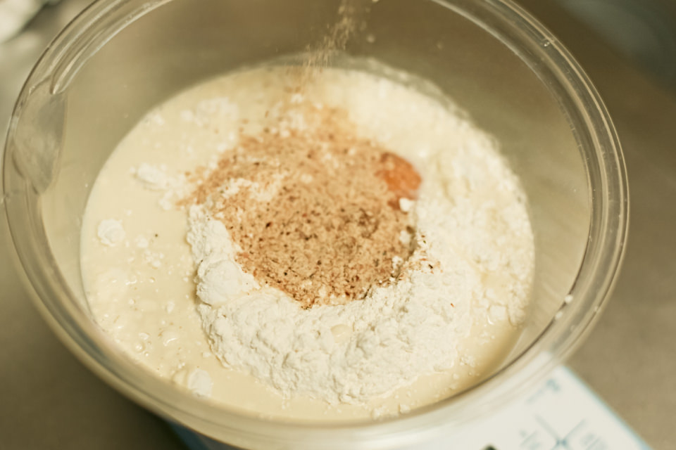 1 薄力粉、水、豆乳、卵、だし粉末をボウルに入れて混ぜ合わせ、冷蔵庫で1時間ほど寝かせて微発酵させる