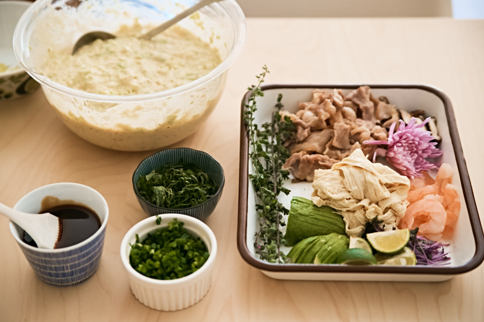 お子さんも大好きだという中上家のお好み焼きは、生地に豆乳を入れるのがポイントだそう。「豆乳を入れると、生地がふわふわになるんです」と敦夫さん。バラエティプレートをセットし、生地を流し込んで焼いていきます。