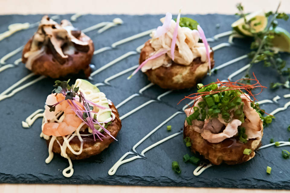 生地をひっくり返し、両面が焼けたらそのままソースをかけます。プレートの熱でじゅわ~っとソースの香りが立ちあがって、すでにおいしそう!「 今日は全てソースですが、しょう油とバターを焦がした味つけも美味しいですよ。このミニお好み焼きは、あとから具をトッピングするスタイルで、一度にいろんな味を楽しめるのが魅力でもあります」