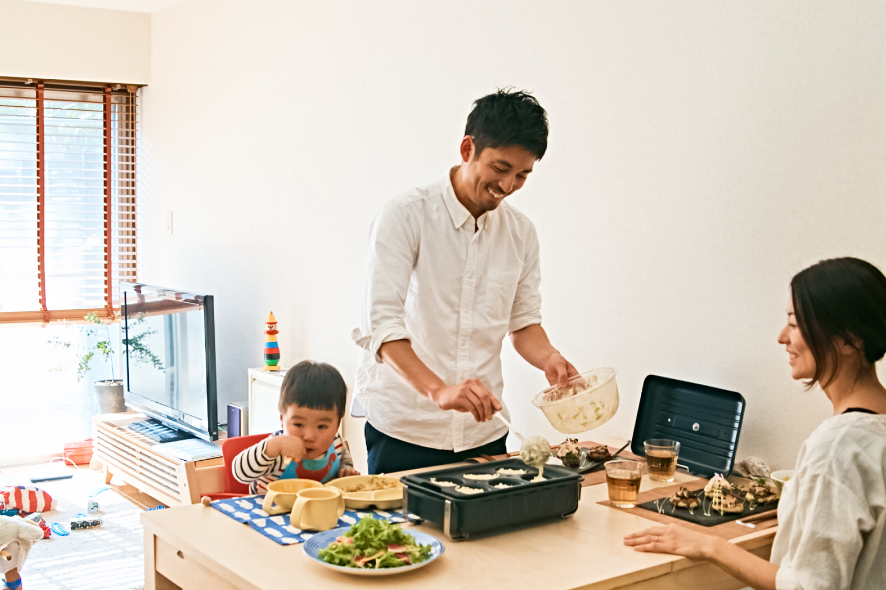 今回お会いするのは、「アツヲ飯」という屋号で出張料理やケータリング、出店料理活動を行う一児の父・中上敦夫さん。三鷹にあるご自宅のマンションで、奥さまの由紀子さんと1 歳になる息子さんの翔真(しょうま)くんの3 人で暮らしています。前編では休日の中上家にお邪魔して、[ホームバーベキュー]を使った、アレンジ満載の“オリジナルお好み焼き” を作っていただきました!