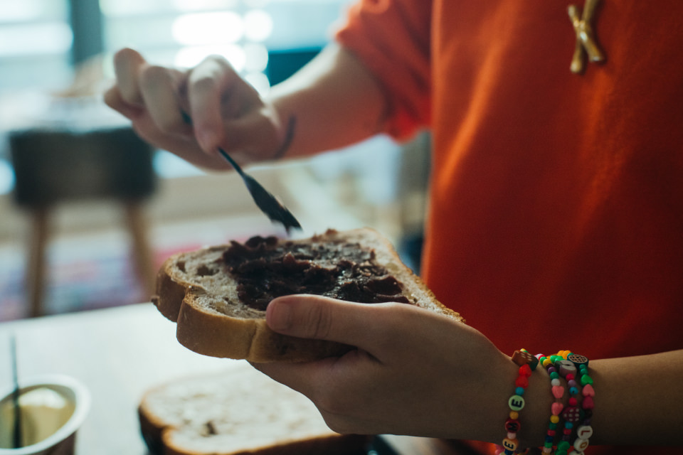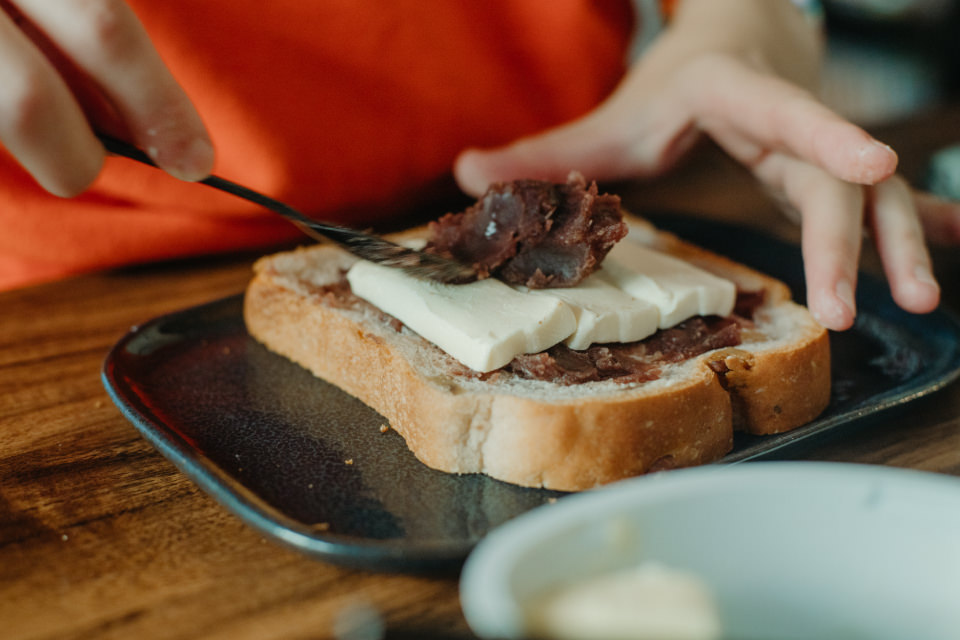 「あんことクリームチーズの食パンは、相性が良さそうなクルミ入りのパンではさみました」と山野邉さん。食パンの種類を変えても違いが楽しめますね。なるほど!