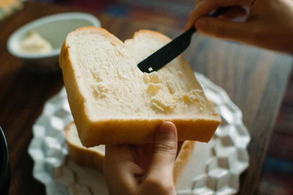 2 食パン2枚の片面にそれぞれバターをぬる