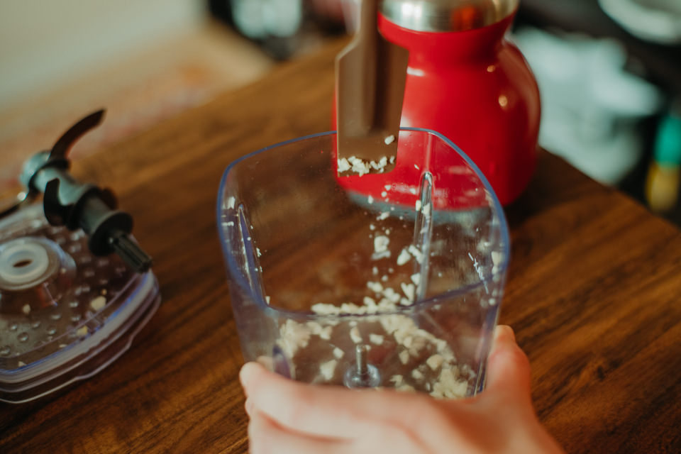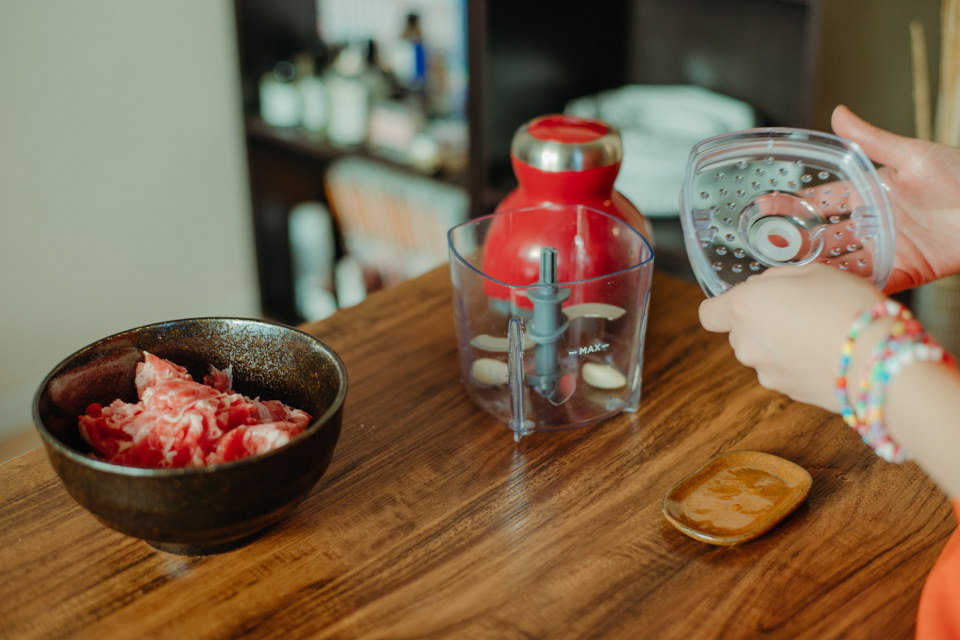 まずはにんにくを[カプセルカッター ボンヌ]でみじん切りにしていきます。[カップ]ににんにくを入れ、びゅんびゅんと2〜3回プッシュするだけであっという間にみじん切りに。にんにくを取り出したら、そのまま[カップ]に豚のこまぎれ肉を入れ、挽肉にしていきます。