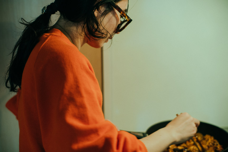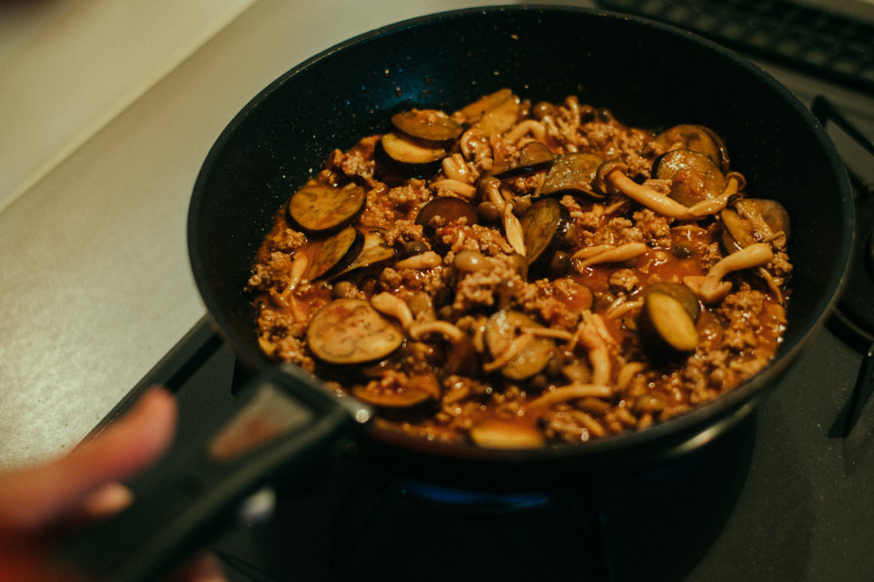 Y:産地やオーガニックを選ぶなどといったこだわりは特になくて、仕事帰りに寄れる普通のスーパーで売っているものを買っています。とにかく“ぱぱっと”が日々の料理のテーマなので…(笑)。でもどんな食材でも使い切る、ということは心がけています。残すのはもったいないし、食材を腐らせることはしたくないんです。予定していたレシピと違っても、余っているものがあれば“きっとおいしくなるだろう”精神で、古いものから使い切るようにしています。今日のボロネーゼも本当は市販のトマトソースを使うつもりでしたが、朝のミートソースが余ったのでそれを使おうと思います。