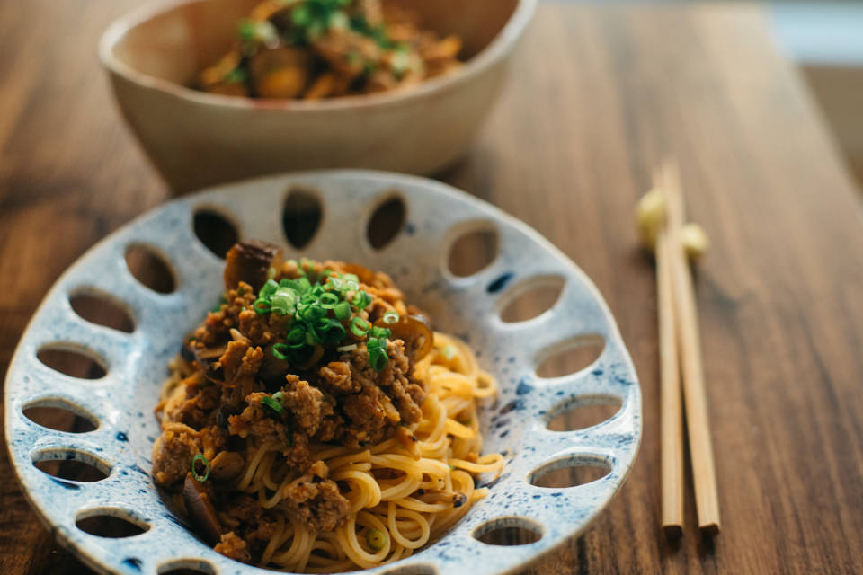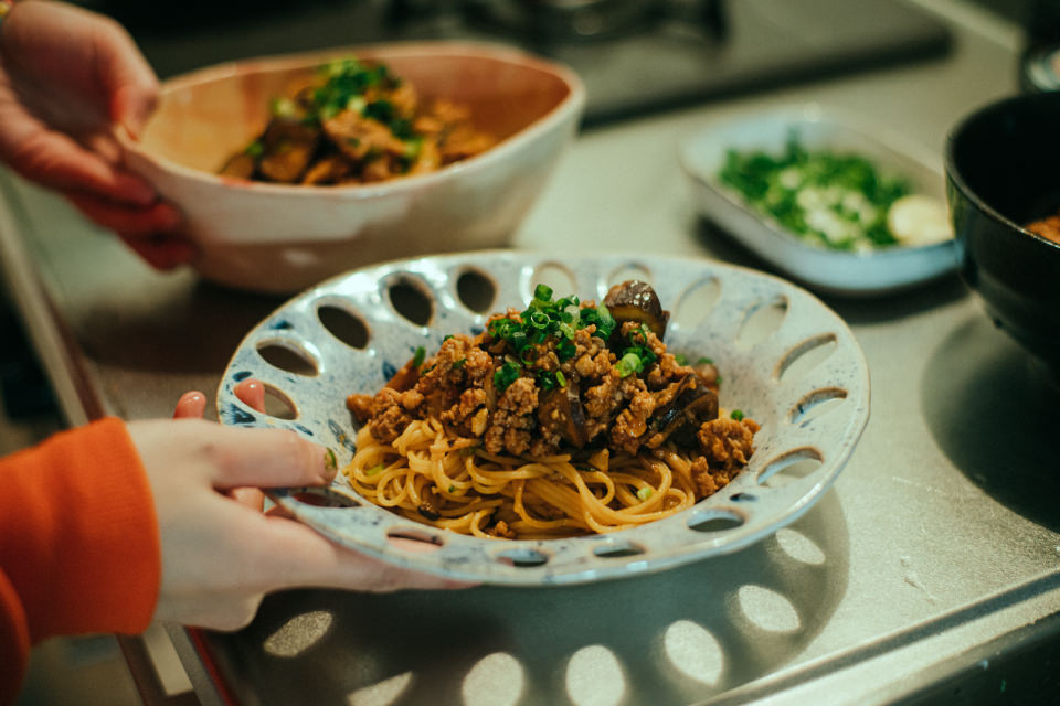 Y:普段の挽き肉とは違って、肉々しい食感があってとてもおいしいです。味噌のコクも感じられておいしくできました! お皿はパスタ用に作ったものなので、料理が映えて、さらにおいしく感じさせてくれますね。