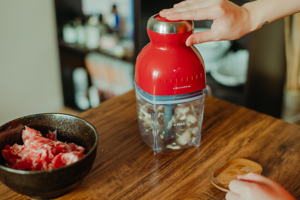 Y:普段どれだけぱぱっと作っているのかがバレますね(笑)。ボロネーゼを作るときはいつ挽肉になっているものを使っていたのですが、[カプセルカッター ボンヌ]は塊肉やこまぎれ肉を挽肉状にできるそうなので、今日は豚のこまぎれ肉を撹拌してミンチにしてみます。スーパーの挽肉との違いが楽しみです!