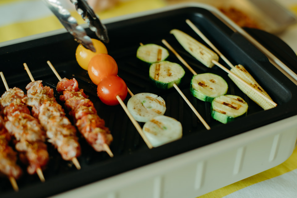 H:いつも使っている竹串の長さと、[バーベキュープレート]のサイズがぴったりで驚きました。きれいに並べられるので最高です(笑)! あとはダイヤルを回すだけというシンプルな操作性と、余分な油が下に落ちるのも嬉しい点ですね。焼き上がった串は[ホームバーベキュー]で温めながらこのあと作るタコスと一緒に食べようと思っていますが、タコスに使う[ラクレット& フォンデュメーカー グランメルト]と2台一緒にテーブルに並べられるサイズ感もいいですね。娘もテーブルクッキングを楽しんでくれそうです!