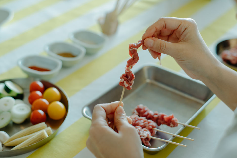バーベキューというと肉厚の骨つき肉や野菜を豪快に焼くことを思い浮かべますが、今回のラム肉はなんと薄切り! 薄切りのラム肉を串にくるくると巻きながら刺すアイデアが斬新です。こうするとお子さまでも食べやすく、もりもり食べてくれるそう!