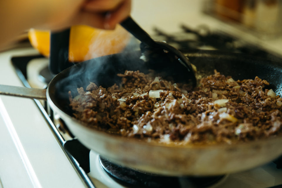 5 フライパンを熱し、油をひかずに合挽き肉を炒める。肉から出てきた油が透明になったら玉ねぎを加え、さらに炒める