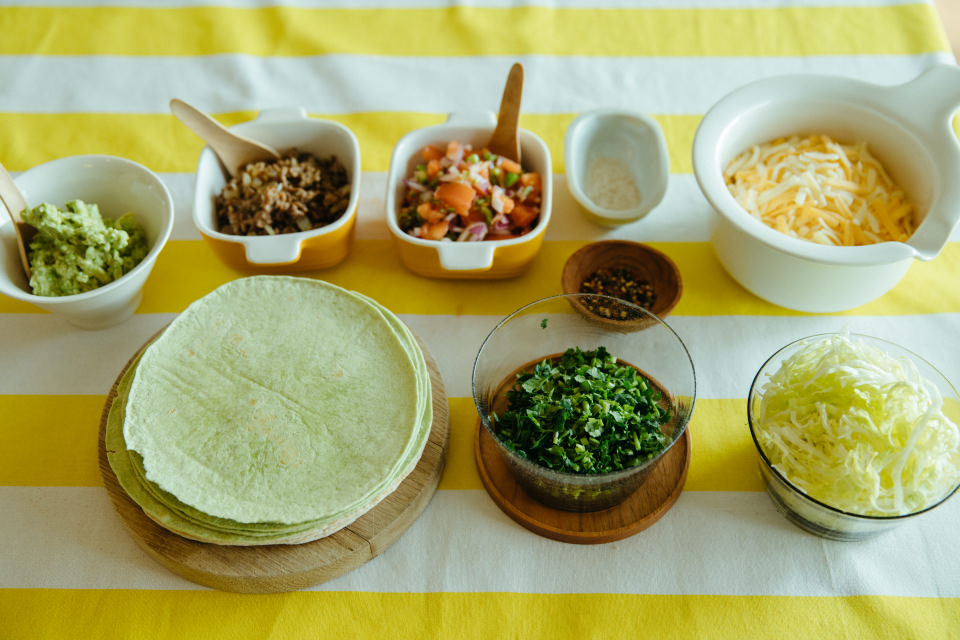 トルティーヤ(今回は直径15cmのものを使用)…10枚/レタス(千切り)…1/ 2個/シュレッドチーズ、パクチー、チップス、ライム…好きなだけ