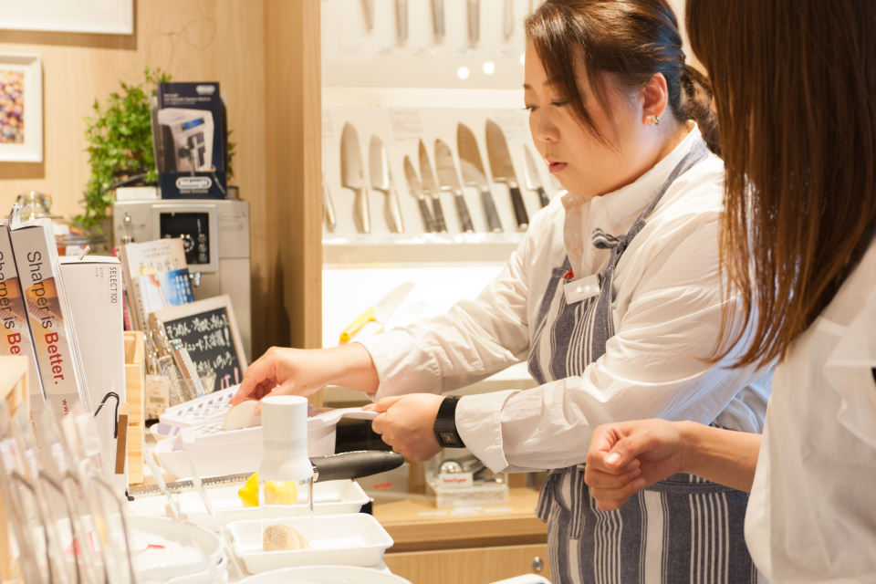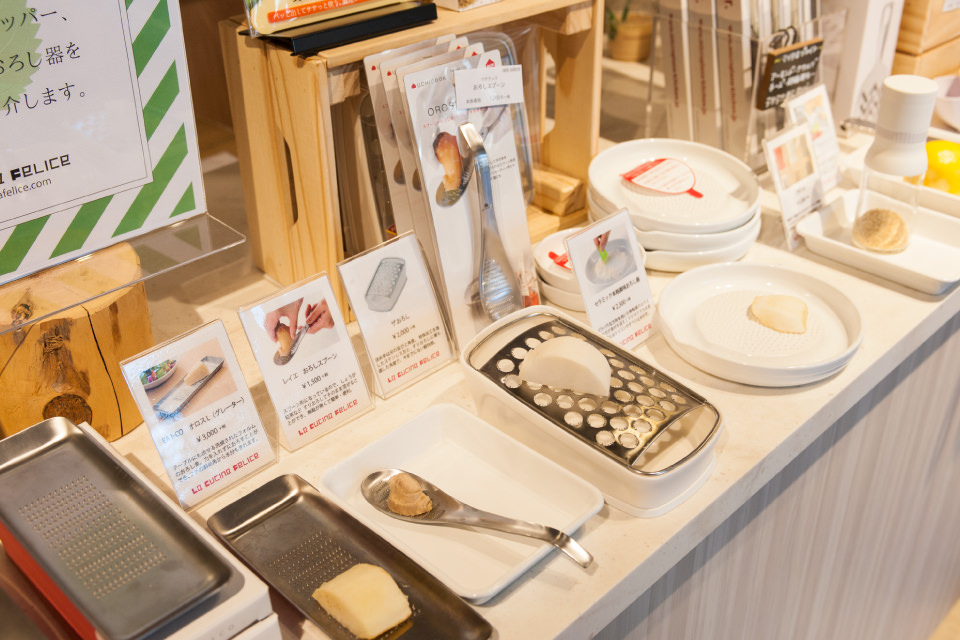 商品の使い心地を実際に試せるのも、La Cucina Feliceの大きな特徴です。「店頭で商品を“体験・体感”してもらうことを大事にしています。店内には実際に使えるアイテムをいくつかご用意していて、ちょうど今は、夏に活躍する薬味をいろんな道具でおろせる特集コーナーも作っています。使ってみないとわからないことは多いですし、直接お客様に使い方をレクチャーしながら、納得して買ってもらえるのはうれしいですね」と田中さん。