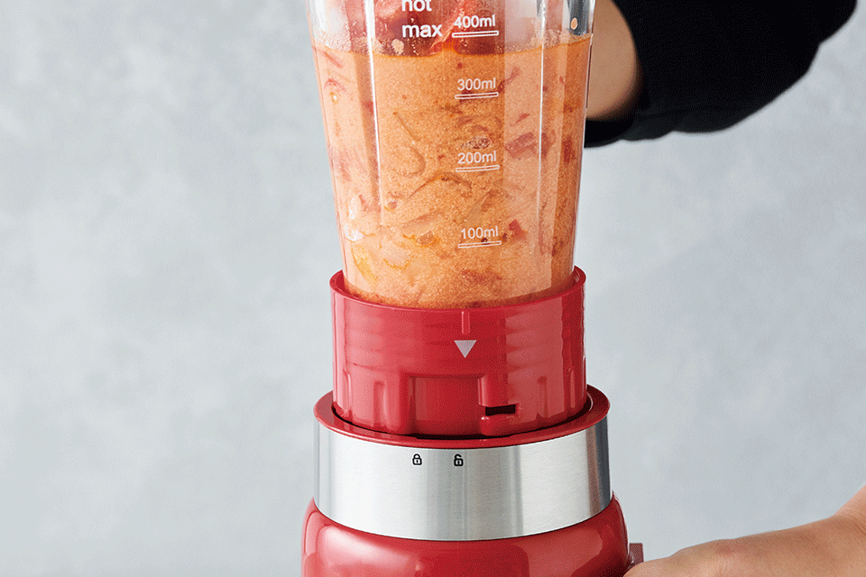 アツアツの食材を撹拌するときも安心のロック機能を搭載。安全性に配慮した使いやすいデザインで、どなたでも簡単に使えます。