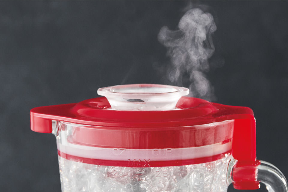 耐熱温度差120℃まで対応できる耐熱ガラス製の[ガラスジャー]を採用し、100℃までの熱湯も氷もOK。炒めた野菜や煮込んだ食材もアツアツのまま撹拌できるので、食材を混ぜたあとに温め直す必要がなく、時短調理が叶います。