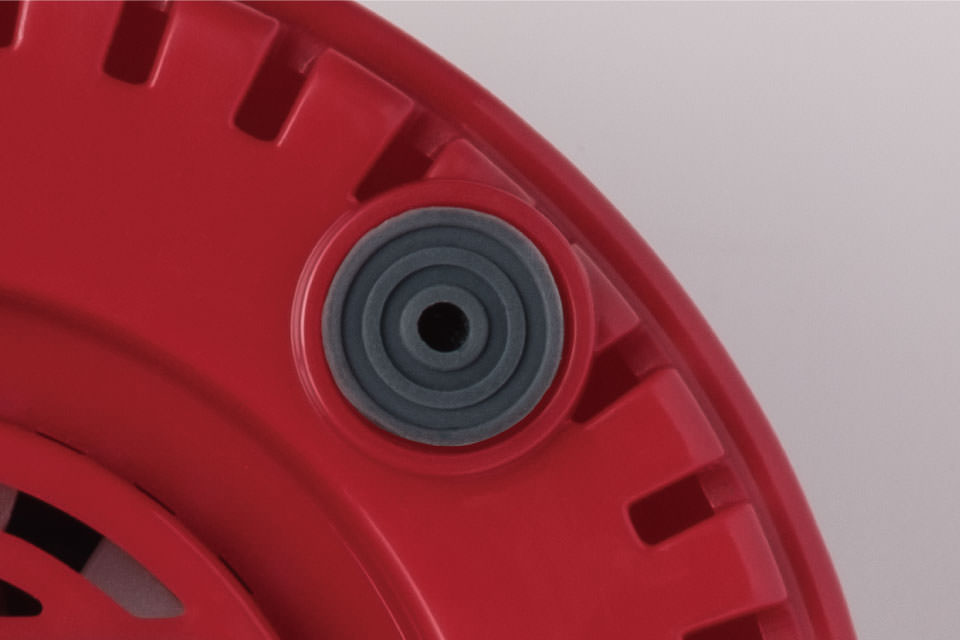 [センターキャップ]の横穴から蒸気圧を逃すバルブ機能付きで、アツアツの食材を撹拌するときも安心。