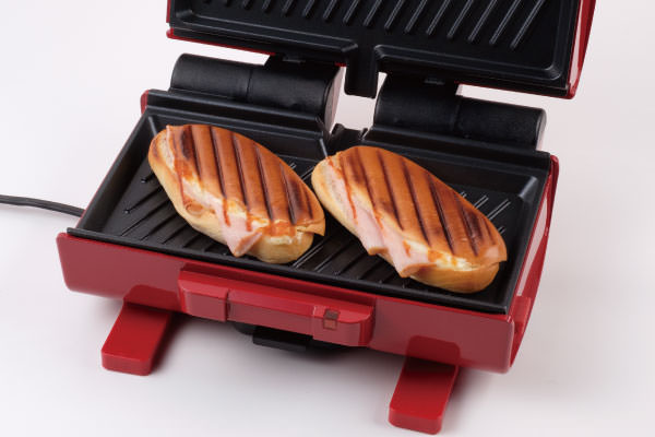 両面からプレスするから、市販のホットドック用のパンでパニーニサンドが作れます。焼き目がしっかり付いてお店のような仕上がりに。