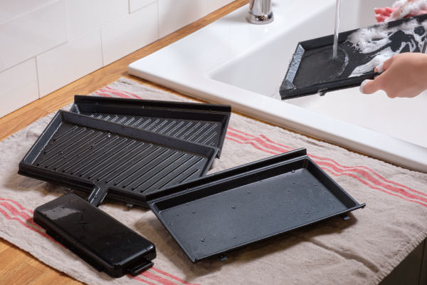 ■ [凸凹プレート]、[フラットプレート]、[油受け皿]を水洗いし、乾いた柔らかい布で拭いてからご使用ください。