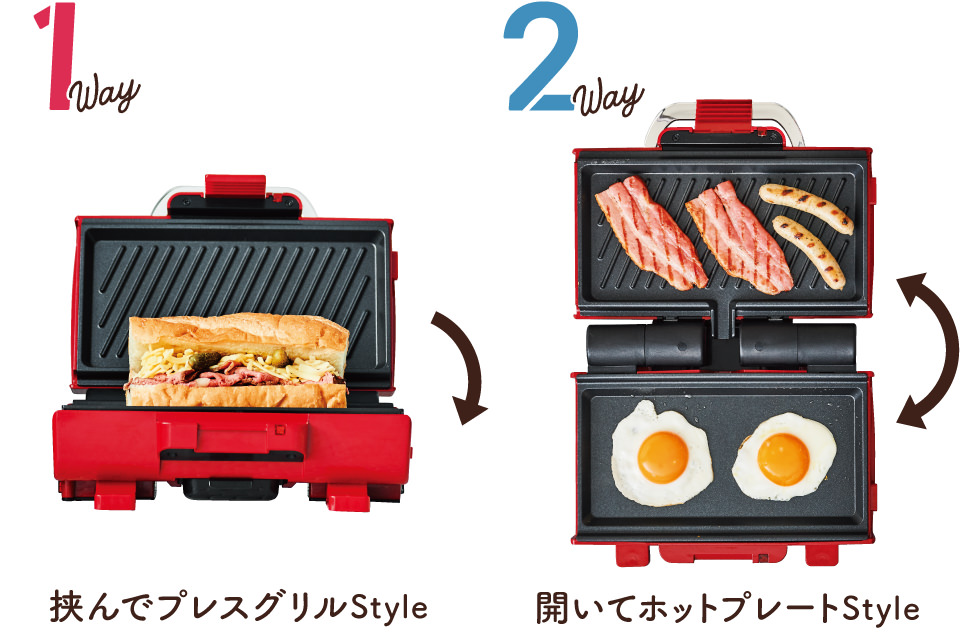 [2ウェイグリル アメット]なら、おいしさをぎゅっと閉じ込める両面加熱のプレスグリルスタイルと、華やかなテーブルクッキングができるホットプレートスタイルの2通りの調理スタイルを楽しめます!