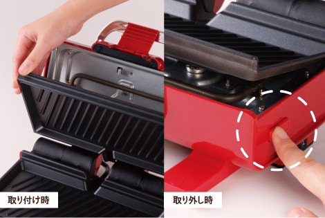 必ず電源を切り、[本体]が冷めていることを確認してから、[本体]右側の【プレート取り出しボタン】を押して[プレート]を取り外してください(上下それぞれに【プレート取り出しボタン】があります)。