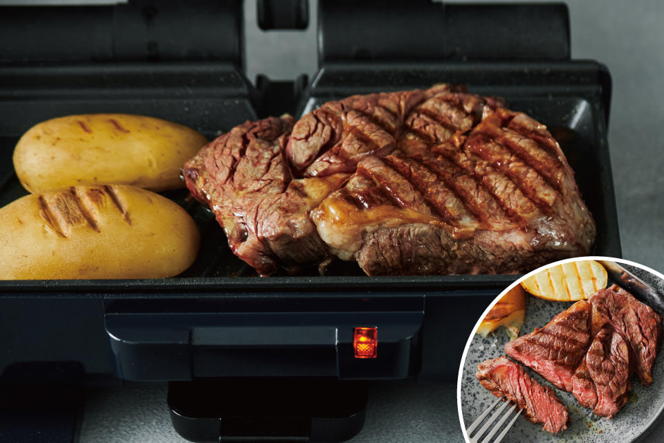 家庭では焼き加減が難しい分厚いステーキも、挟んで待つだけで簡単にミディアムレアな焼き上がりに。