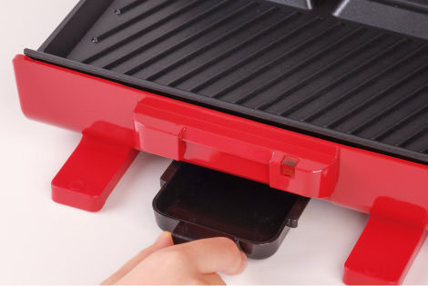 [凸凹プレート]は、見た目もおいしい焼き目がシッカリ付くのが特徴です。スリットから[油受け皿]へ油が落ちるのでヘルシーに調理可能。