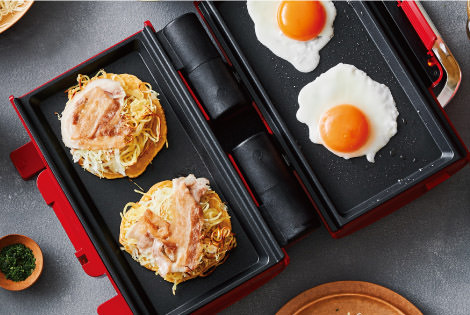 お好み焼きも返し不要で出来上がり。[2ウェイグリル アメット]に挟んでお好み焼きを作ったあと、開いてもう片面で目玉焼きを作り、最後に合わせるだけ。