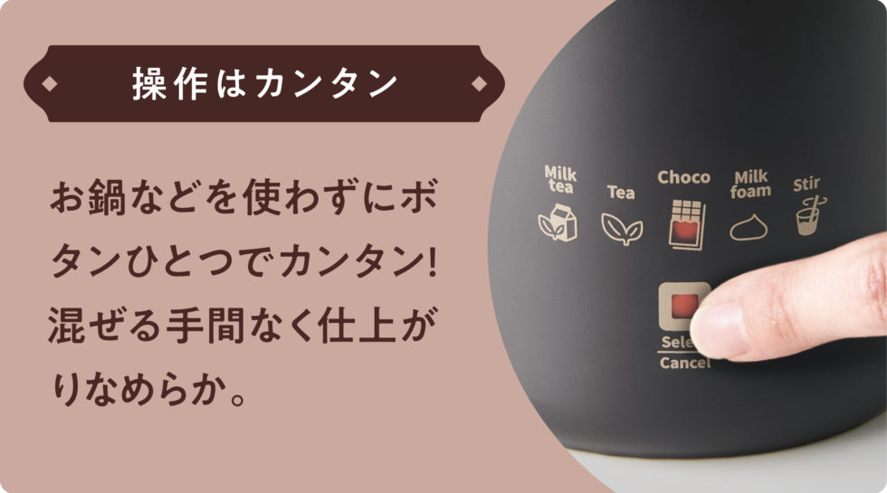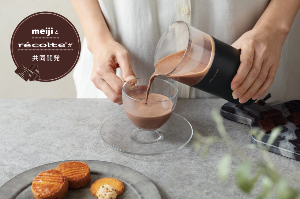 濃厚&芳醇なチョコレートドリンクをいつでも手軽に楽しんでほしい。そんなmeijiの思いにレコルトが共感![チョコレートドリンクメーカー]なら、材料を入れてボタンをタッチするだけで、香り豊かなおいしいチョコレートドリンクが味わえます。