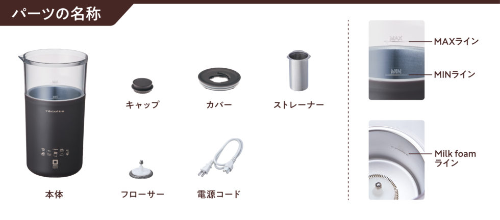 ※[ストレーナー]なしで使う場合:Milk foamライン(約100ml)~MAXライン(約350ml)